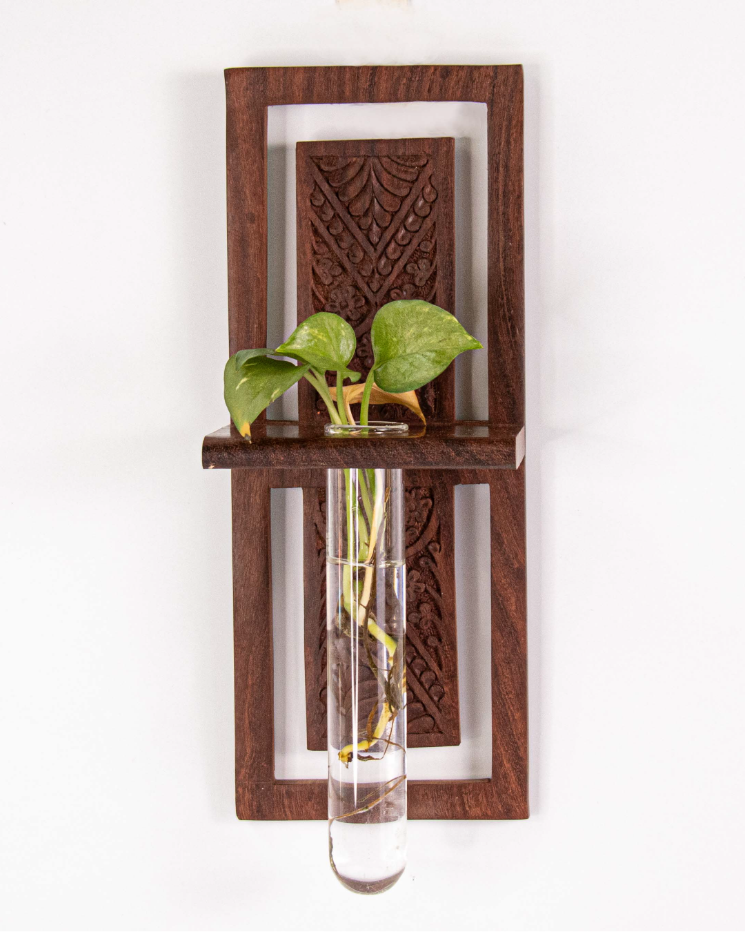 - The intricate carving with glass adds a vintage yet stylish and modern look to any space. These eye-catching hydroponic planters add drama to any wall while keeping the style minimalistic and classy. This is the best way to propagate your favourite plant while adding extra glamor to any ordinary wall. Made of premium wood and borosilicate glass tubes, the wall-mounted planter allows super easy propagation. This is a perfect stylish and thoughtful gift for any plant lover.