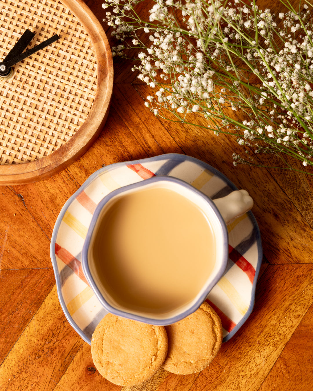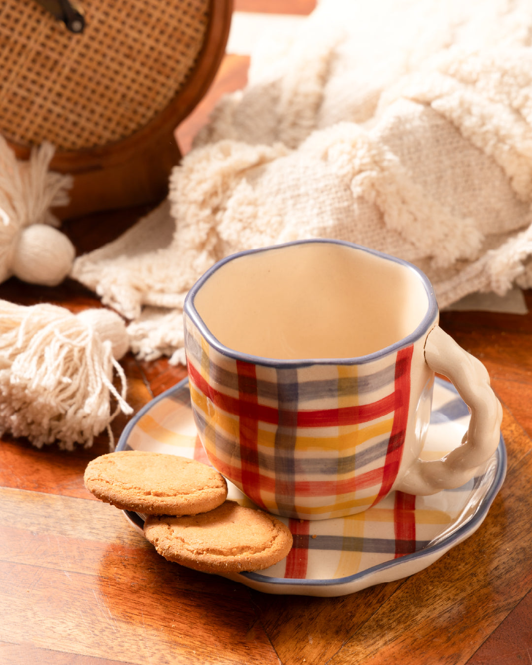 Vibrant Hand-Painted Cup and Saucer Set: Elevate your daily coffee or tea ritual with our dynamic Red, Blue, and Yellow Bold Checked Print set, designed to infuse personality into your morning routine.