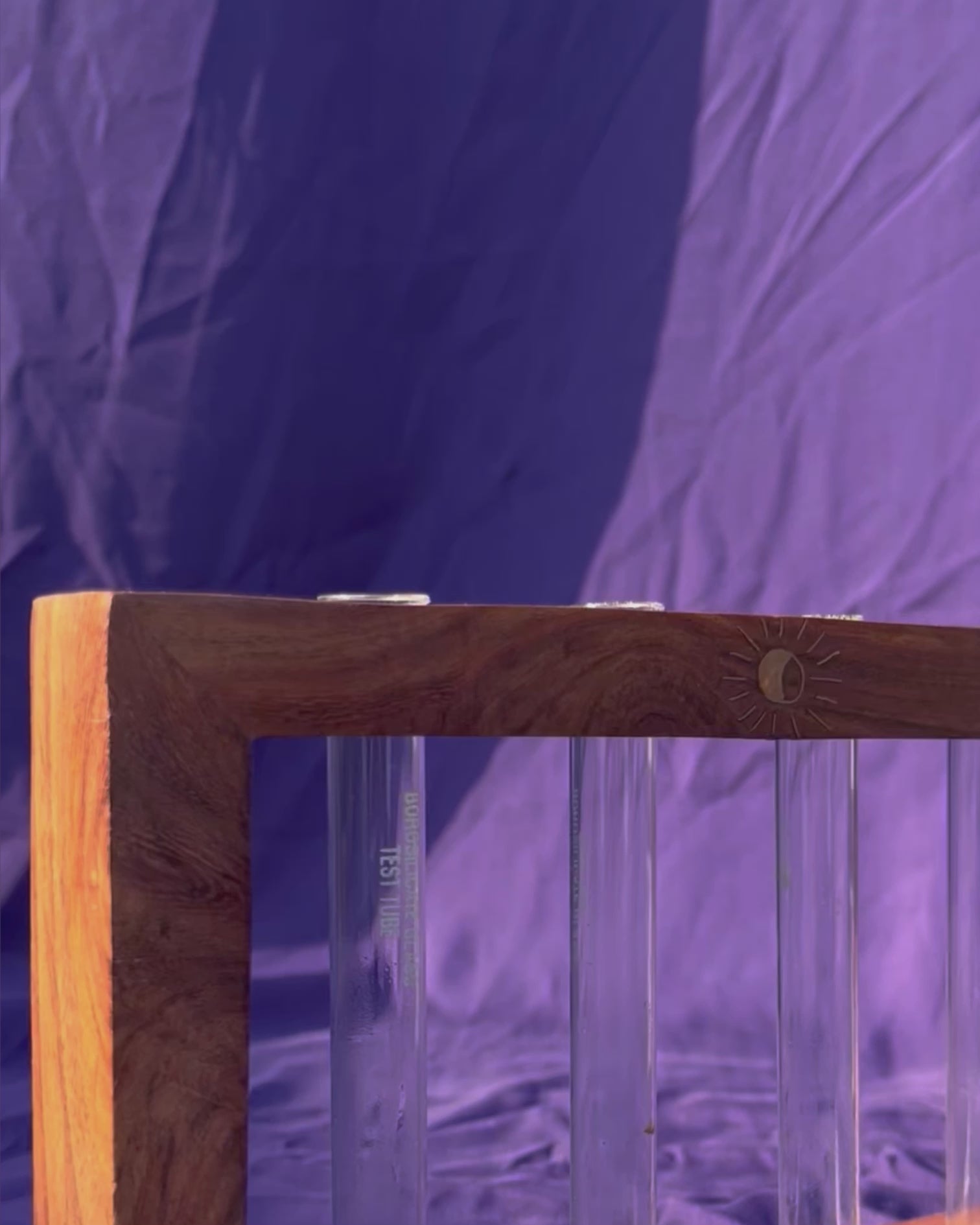 - A rectangular wooden frame with half moon brass inlay with transparent test tube planters. The minimal and unique vintage design and the transparency of the tubes add charm to any place, adding an authentic and elegant look. The planter can be placed in all spaces inside the house which will enhance the look of a home and office decoration. You can mount the frame on a wall or place it on the surface. This is the best way to propagate your favorite plant while decorating your tabletops or coffee table. This is a functional design as the borosilicate tubes are easy to clean and refill. Decorate your home or office with this small test tube vase in a wooden stand for a vintage look.