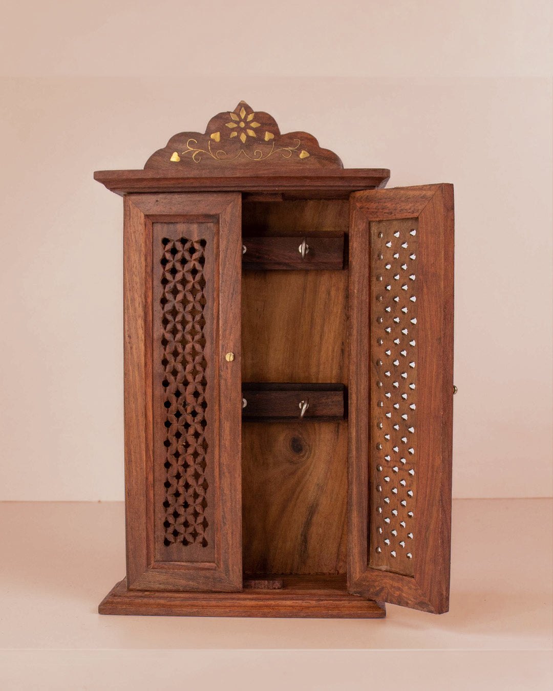 - The antique style Jaali Design carving on almirah gives it an indigenous appearance and helps in creating an exceptionally elegant appearance. The Wooden key box is designed to keep your keys in a safe place. The key box is in Sheesham Wood with the work of tarkashi brass inlay on it. Key boxes can be used as wall pieces as it can be placed anywhere in the house. This will bring a fusion of style and beauty to your home.