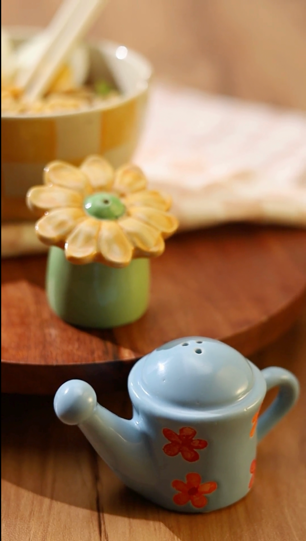 Charming Nature-Inspired Design: Sunflower-themed shakers with a delightful watering can shape.