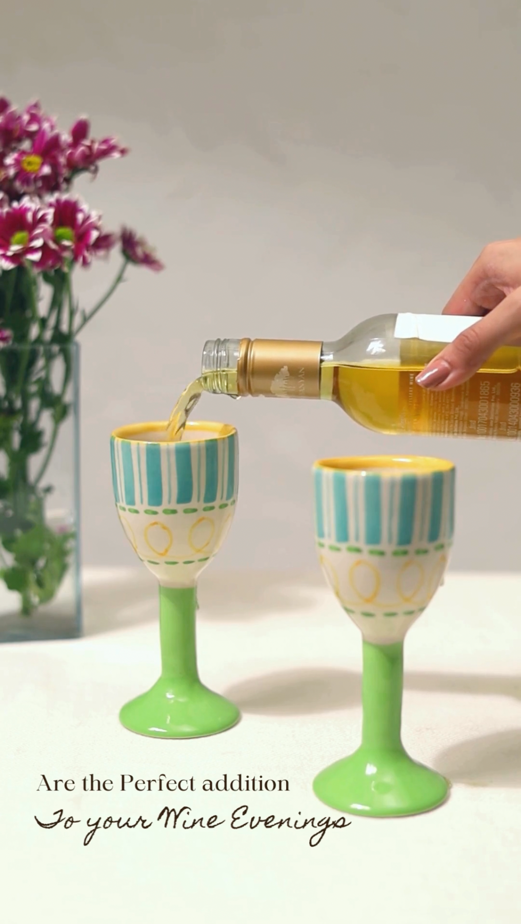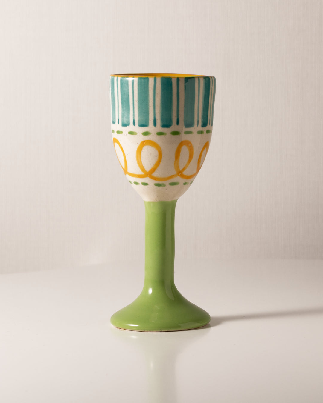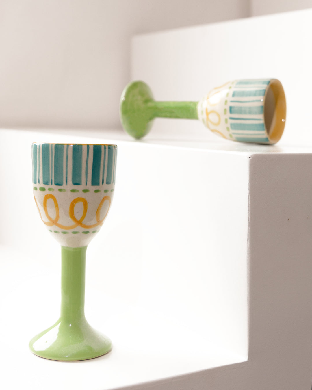 Artistic Masterpieces: Crafted by skilled artisans, each goblet features unique green, blue, and yellow hand-painted designs on high-quality ceramic.
