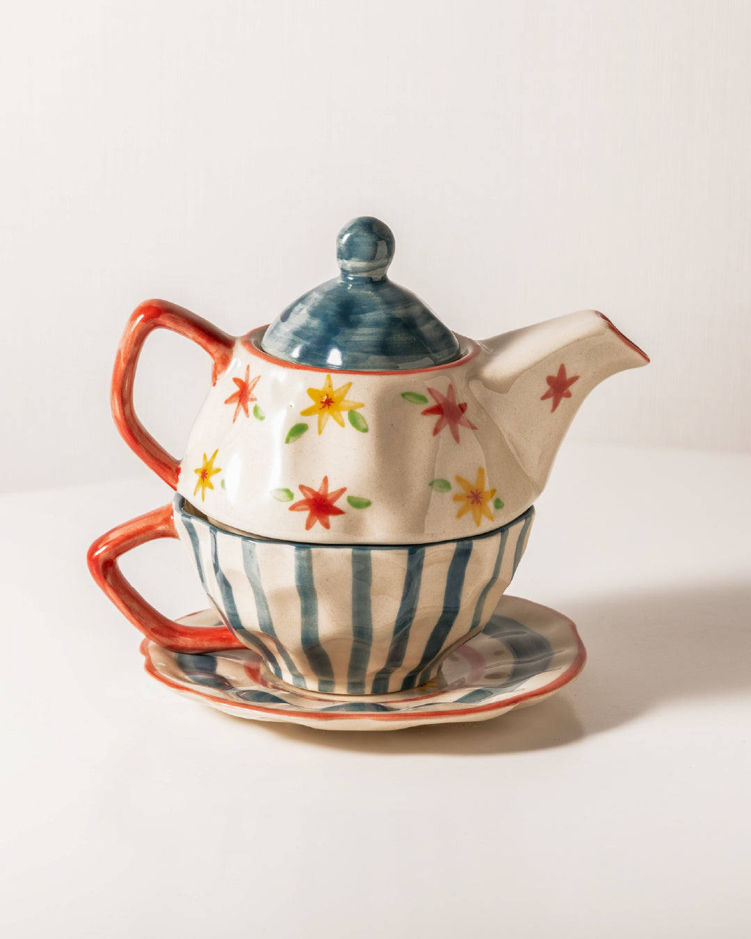Handcrafted Ceramic Tea-Set-for-One: A Tea-rrific product that adds a touch of whimsy to your tea time ritual with its vibrant yellow, red, and blue colors.